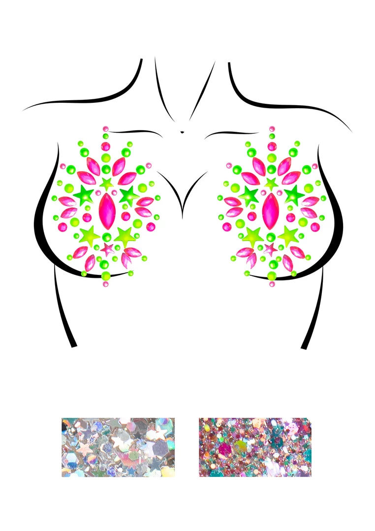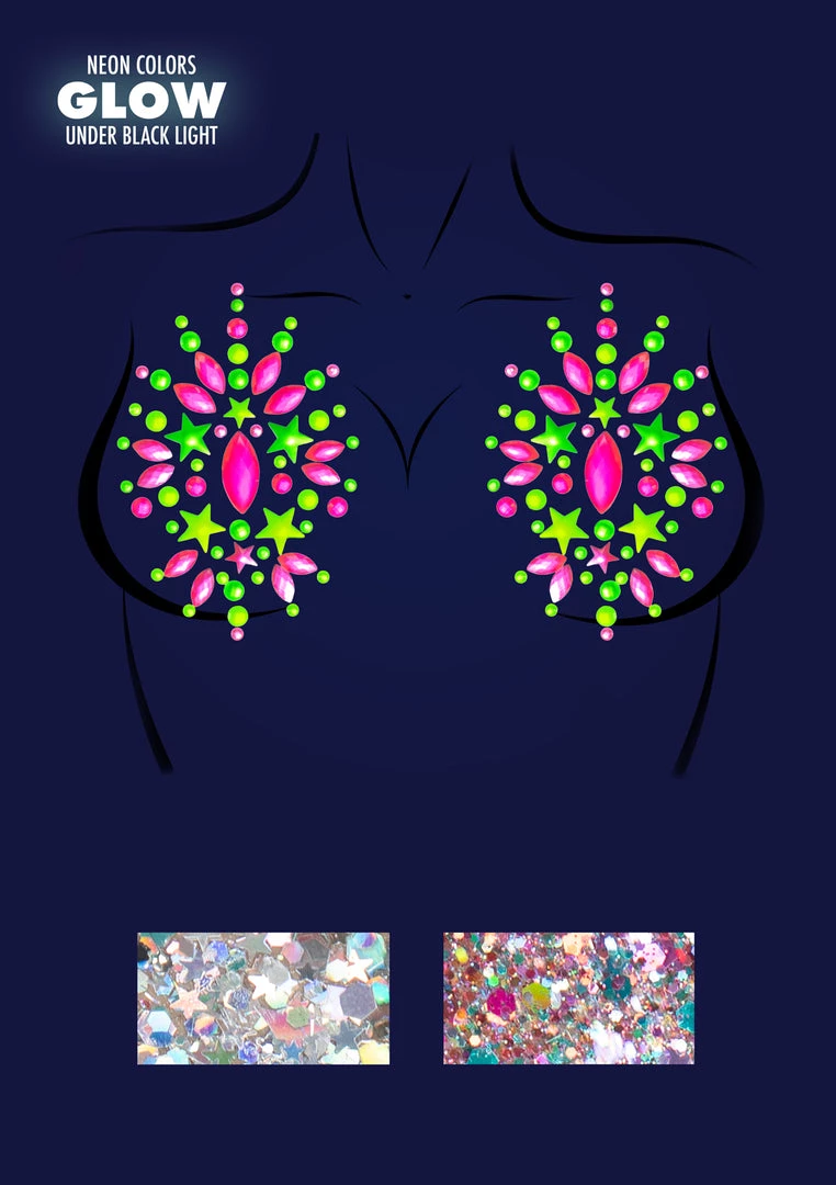 Riot neon adhesive black light jewel nipple stickers and (2) 3g body glitter packets.