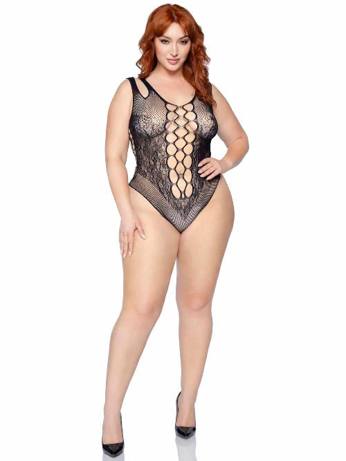 Bring the heat in this sultry plus-size lingerie teddy by Leg Avenue. Net and lace design with a plunging wide net front and low, close back, this bodysuit is perfect for layering, lounging, or flirty bedroom fun.Â