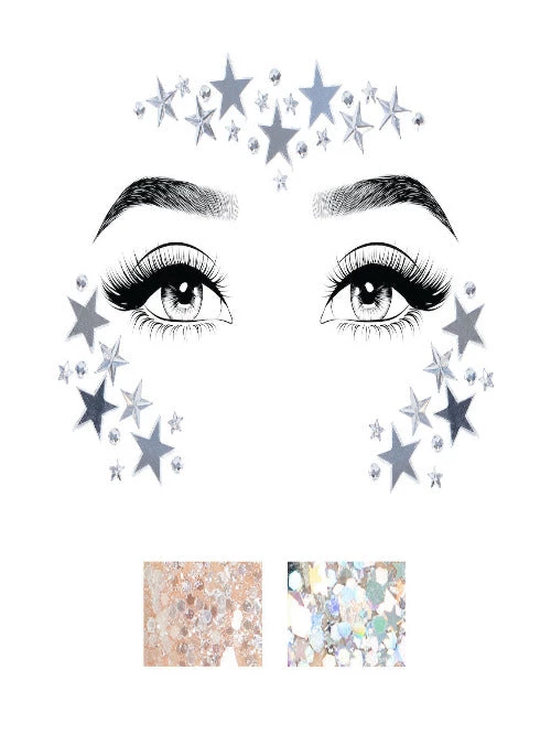 Dream adhesive mirror star and rhinestone face sticker and (2) 3g body glitter packets.