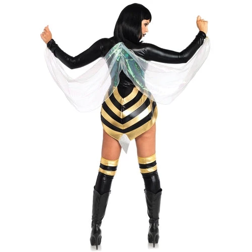 Includes wet look zipper front garter bodysuit with foam stinger, attached iridescent wings, and matching thigh highs. color black/gold.
