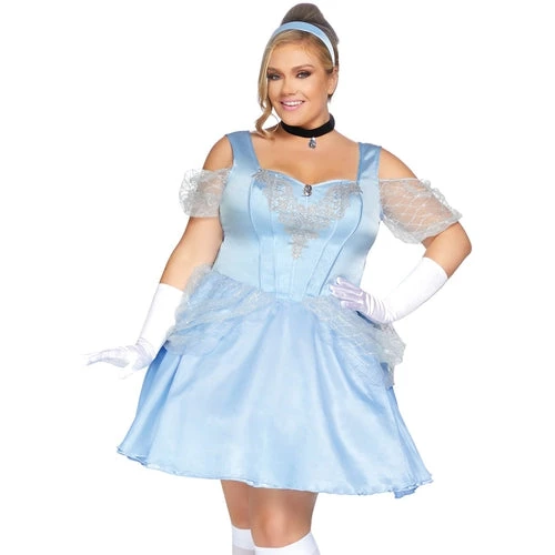 Stay out past midnight in the 3 PC Glass Slipper Sweetie plus size women’sΒ Halloween costume by Leg Avenue. This princess costume look features a cold shoulder mini ball gown that features a jeweled lace applique accent, choker necklace, and matching headband. And don’t worry, no mice were involved in the production of this dress. (Gloves not included)