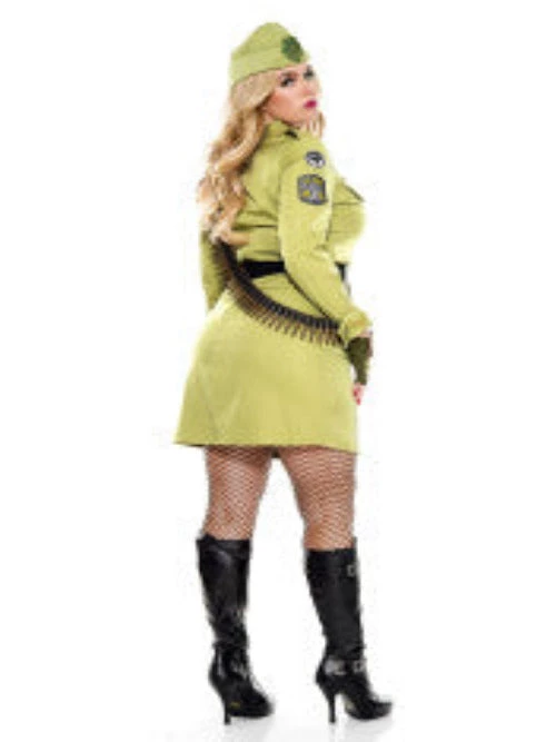 You’ll be the perfect soldier in this plus size Military Cadet costume featuring a green dress with long sleeves, a front zipper closure, faux pocket detailing, medal appliques, a black waist belt with a silver buckle, a bullet sash, a matching green hat with applique detailing, and dark green gloves. (Fishnet pantyhose not included.)