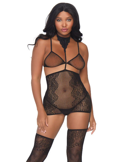 Set your standards high and your stockings higher with this sexy fishnet lingerie set by Leg Avenue. Equal parts feminine and naughty, this lingerie garter set features a fishnet bra, lace garter skirt with body harness halter, and matching thigh highs. (Thong panty not included)