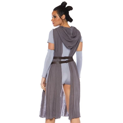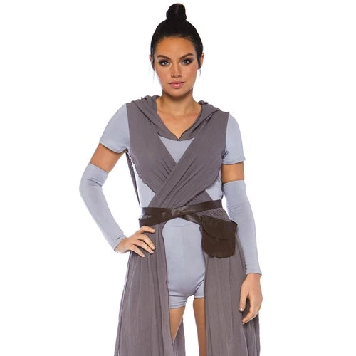 Defend the universe while looking like a total badass in the 3 PC Galaxy Rebel womens costume by Leg Avenue. This iconic Halloween costume look includes an ultra-comfy romper with gauze cross over sash and attached hood, matching arm pieces, and a cross over pouch belt. (Fighting staff not included)