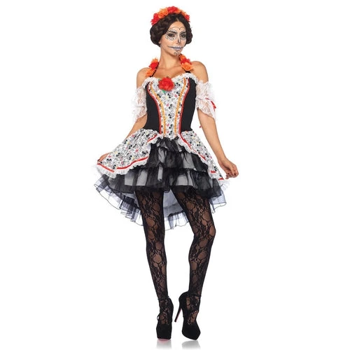 Celebrate Day of the Dead in gorgeous fashion with the 2 PC Sugar Skull Senorita womens costume by Leg Avenue. This stunning sugar skull costume features a high/low sugar skull print dress with lace sleeves and floral halter straps, layered ruffle tulle skirt, and a matching floral headband.