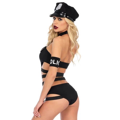 Stop traffic in the naughty 6 PC Undercover Cop womens costume by Leg Avenue. This sexy Halloween costume includes a strappy halter bodysuit, police arm bands, toy walkie talkie, police badge, and matching police hat.
