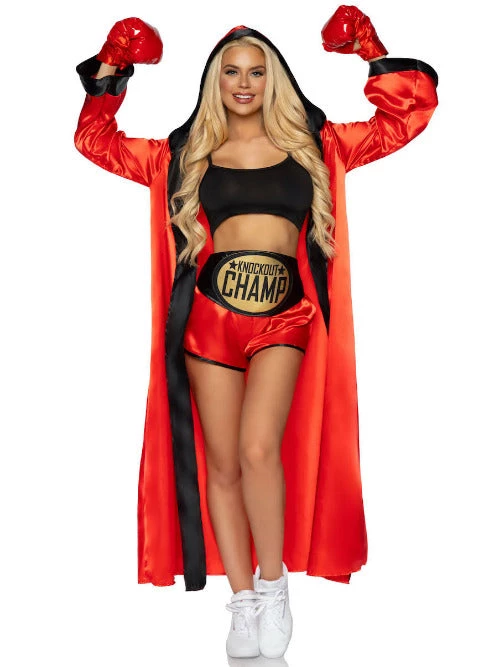 Knockout Champ Boxer CostumeGive them the old one-two punch in this show-stopping Leg Avenue 5-Piece Knockout Champ. Get ready for that championship bout in the bold boxer costume featuring crop top, shorts, satin hooded robe, champion belt, and boxing gloves. From bell to bell, the stretchy crop top and high waist elastic waistband shorts will keep you comfortable the whole night through. Top off this boxer beauty look with the floating hooded satin robe and vinyl boxing gloves.Complete the strong and sassy costume with white athletic sneakers. Perfect for Halloween, cosplay or theme costume parties. Sizing: Small/Medium fits size 4-8 and Medium/Large fits size 10-14.