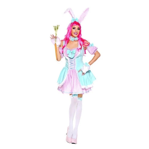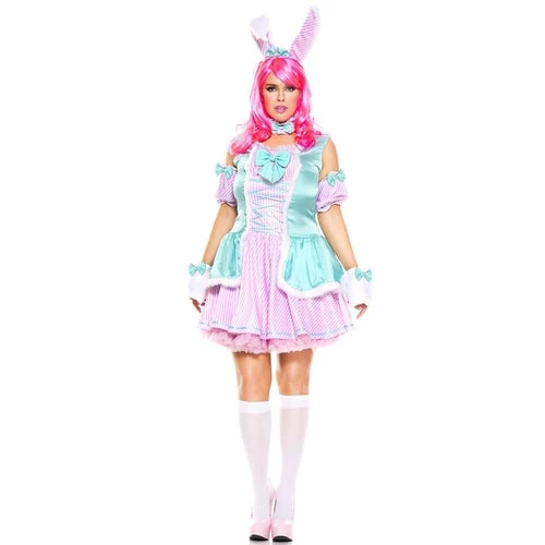 Includes: Striped two tone dress with furry trim, bunny ears, puff sleeves, gloves and thigh hi