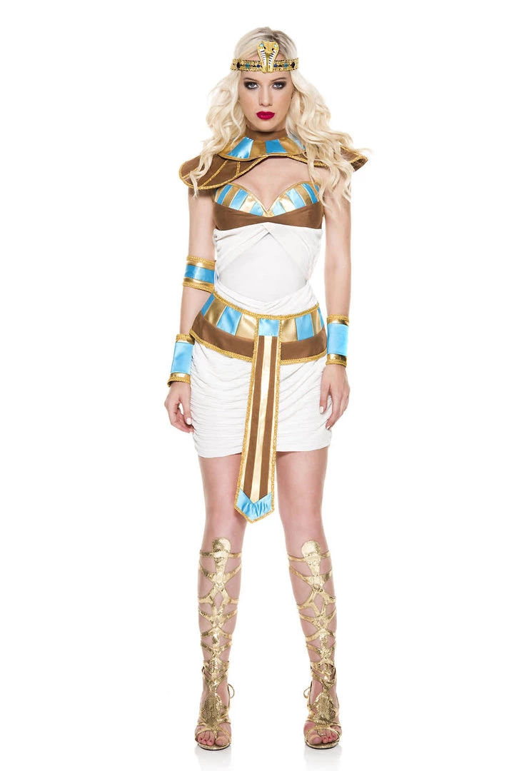 6 PC Includes White ruched dress with bust detailing,snake shaped Headband, collar, belt,wrist cuffs and armband.