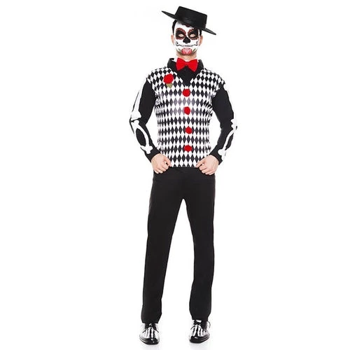 The three-piece Men’s Graveyard Mister costume includes a skeleton print top with attached harlequin vest, roses, bow, hat, and mask. (Pants not included.)