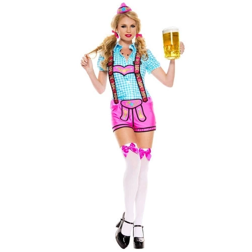 4 pc. Button up plaid shirt and adjustable suspender shorts with floral brocade trim Includes: hat and and 2 satin hair bows