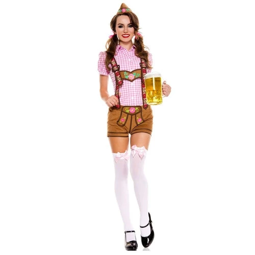 4 pc. Button up plaid shirt and adjustable suspender Bavarian inspired shorts with floral brocade trim Includes: hat and and 2 satin hair bows