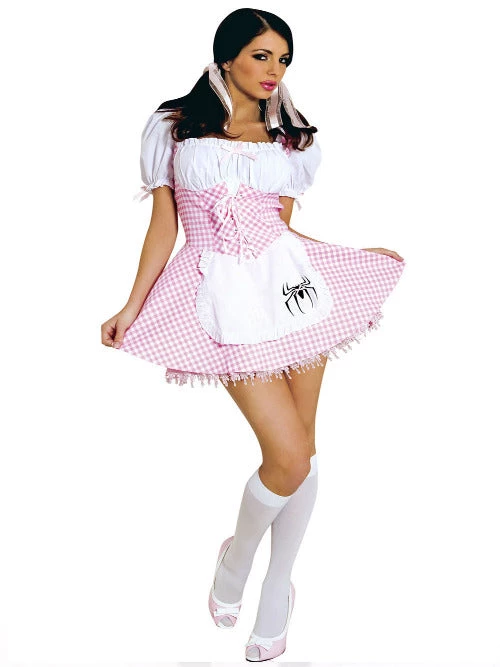 ๏ปฟPink Gingham Muffet adult costume includes a pink and white dress with attached apron. Petticoat and knee-high socks are not included.