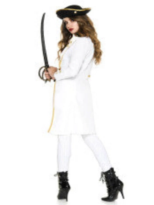5 PC. includes: Gold button high neck top, white coat with gold trim, striped pants, hat, and belt