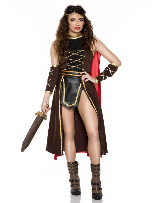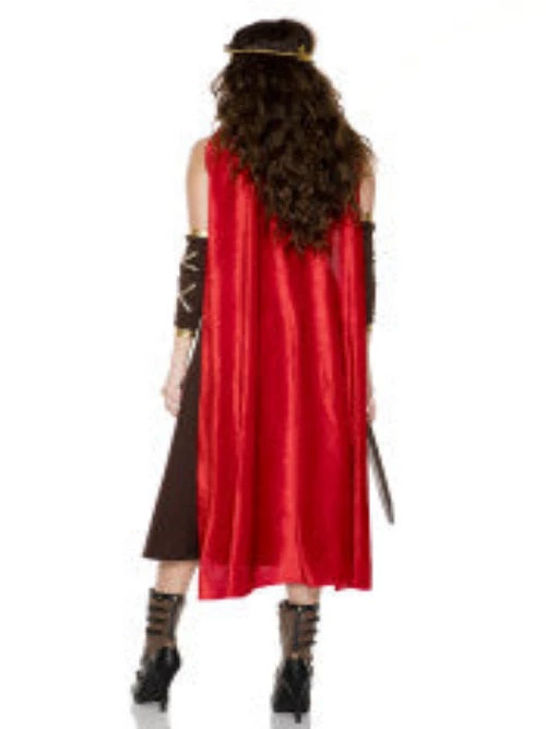 4 PC. includes: Gold ribbon lace up dress with attached belt and front panel, detachable cape, criss cross arm warmers, and headband