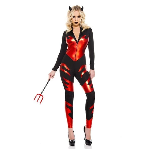 Turn up the heat in this Sizzling Devil costume featuring a black jumpsuit with long sleeves, a front zipper closure, red flame detailing, a black horn headband, and a toy pitchfork.