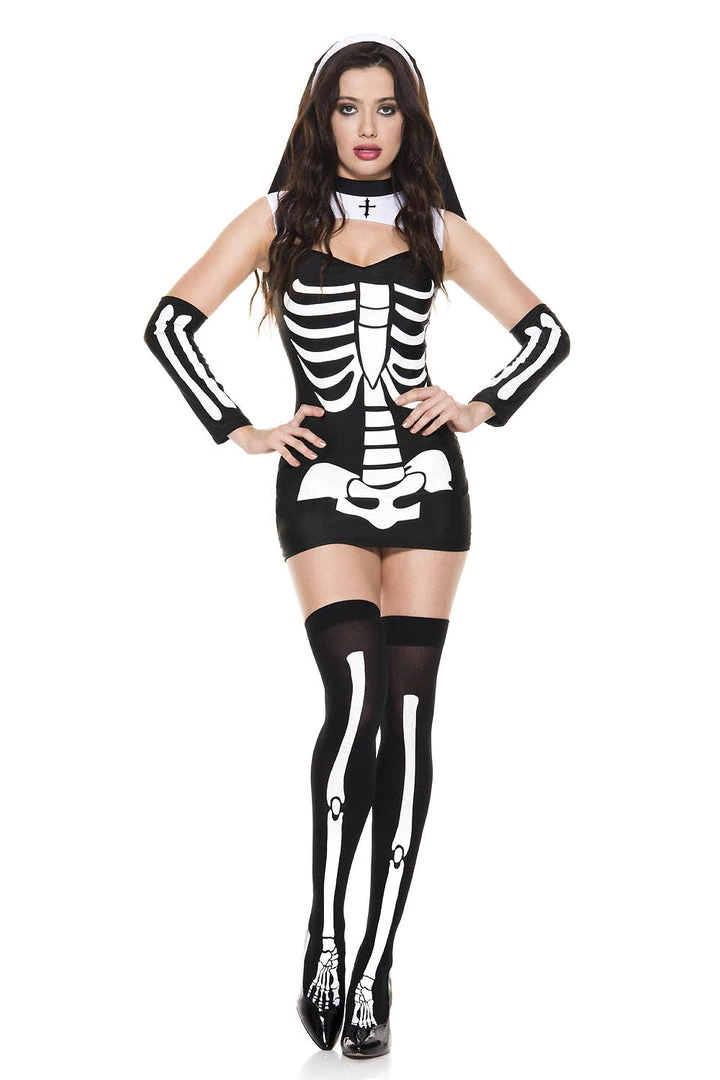 4 PC Includes Skeleton print dress, habit, matching arm warmers and skeleton print stockings