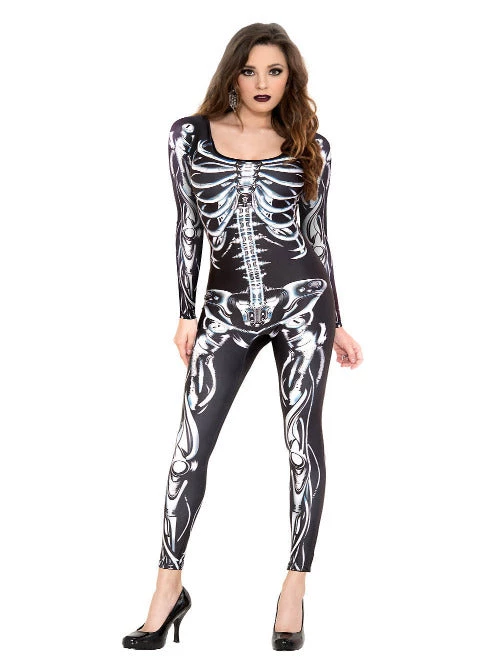 Bring the treats this Halloween and show off your hot bod in this black Mechanical Skeleton Catsuit featuring a scoop neckline, long sleeves, a scoop back, a skinny leg, and a white mechanical skeleton print with blue accents.