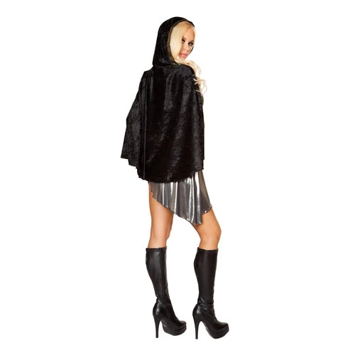 Includes Dress with Lace-Up Detail, Waist Cincher, and Hooded Cape. color Gun Metal and Black Fabric Poly/Spandex