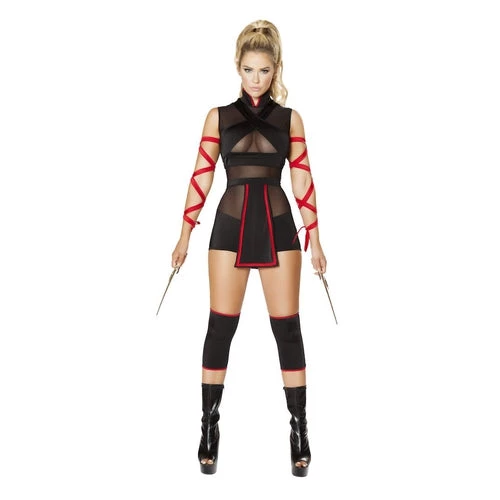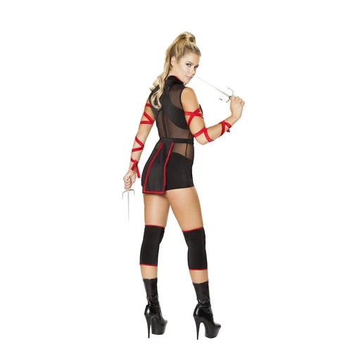Hide in the shadows with this Ninja Striker costume featuring a black romper with a high neck