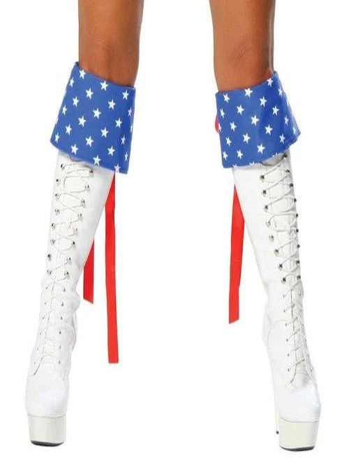 One size fits most, these red white and blue patriotic boot cuffs make a great gift or holiday stocking stuffer.