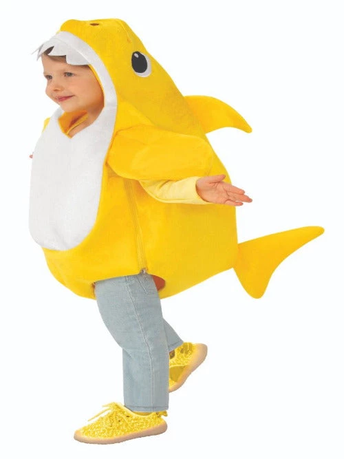 Yellow shark child romper; side-fin shoulder covers; dorsal fin and tail-fin in back; attached shark character hooded headpiece with teeth lined face opening; and original sing sound chip with on/off switch