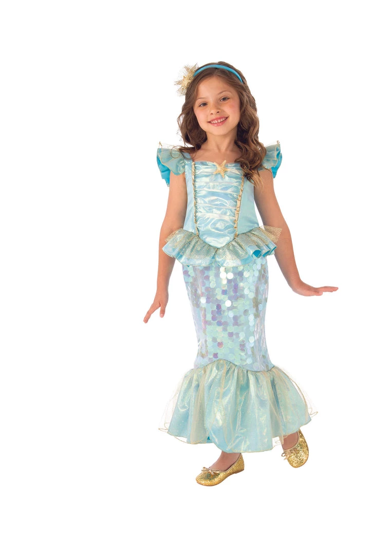 Mermaid dress lets you walk even with a fish tale! Color of a sparkling blue ocean with pearl beads and shell-inspired dress top.