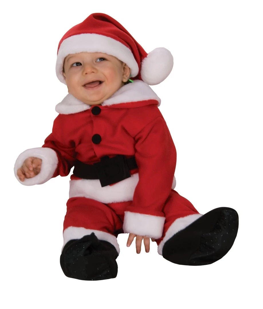 A Santa suit sized for someone celebrating their first Christmas, fits most babies up to 6 months