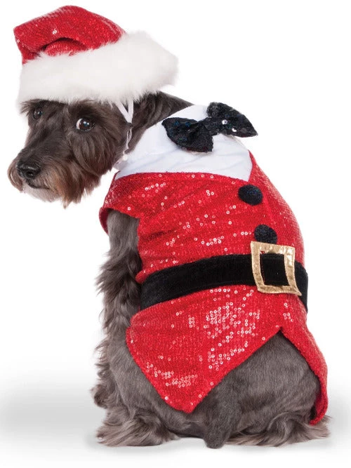 2-Piece Santa Claus pet costume includes red sequined coat with attached belt and Santa hat with white faux fur trim and pompom