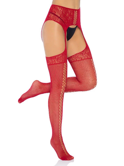 Get all caught up in the Sia faux lace up backseam fishnet stockings by Leg Avenue. This versatile hosiery look features a multi net design with the floral lace top and a high waist attached garter belt. Panty not included.